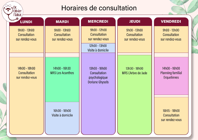 Le temps alloué pour une « Consultation Classique » est de 15 minutes ! Si vous avez besoin d’aborder plusieurs contextes cliniques, merci de vérifier auprès du secrétariat la possibilité d’étendre le temps de consultation ou de fixer plusieurs rendez-vous.